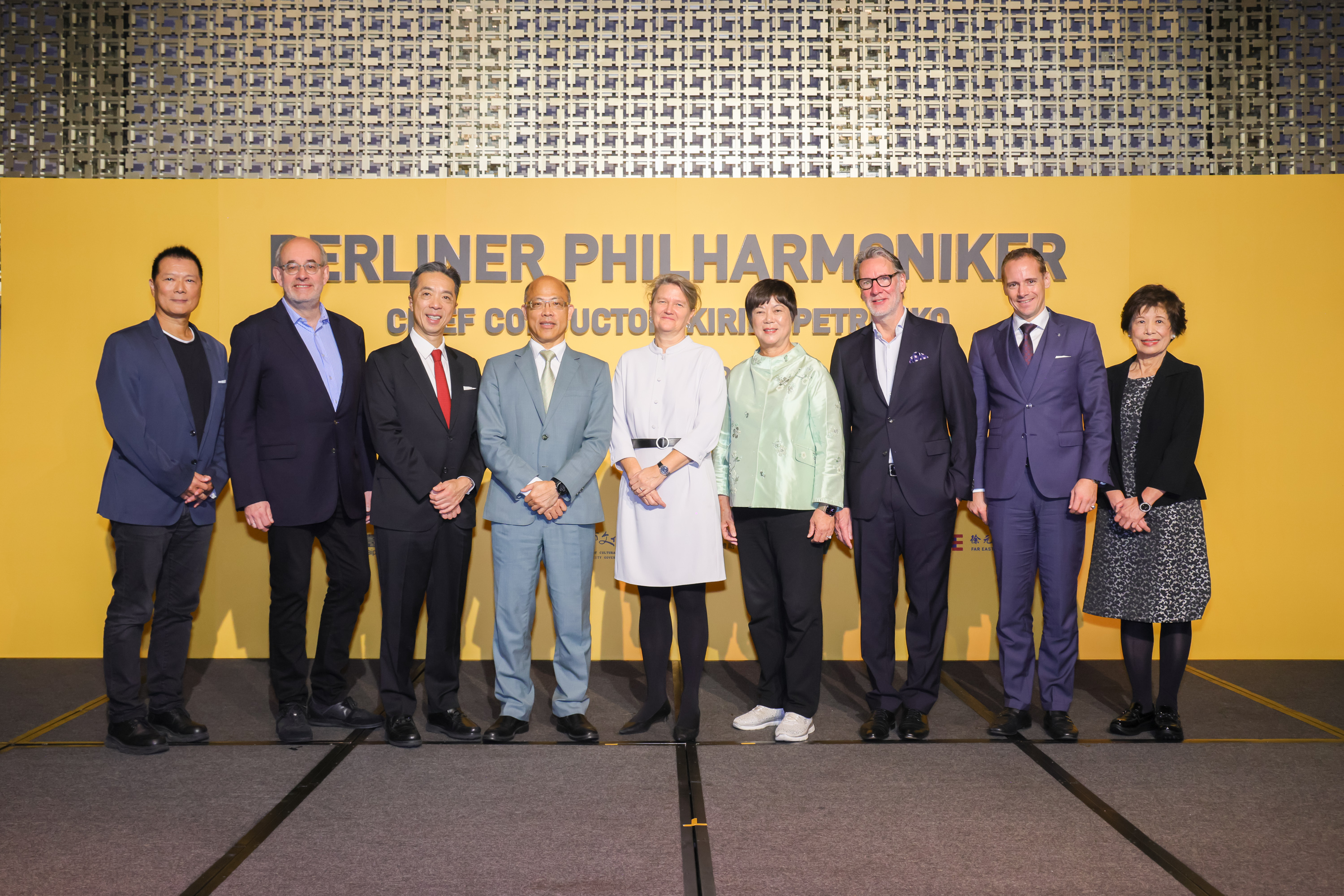 ▲ 官方與贊主商合照站位(由左至右)臺北市文化局局長 蔡詩萍 先生、柏林愛樂董事會代表 華特.屈斯納 先生、勇源基金會董事長 陳致遠 先生、玉山銀行資深副總經理 林榮華 先生、柏林愛樂總經理 安德萊雅·齊茨施曼 女士、台積電資深副總經理暨ESG委員會主席 何麗梅 女士、柏林愛樂媒體委員會代表暨數位音樂廳創辦負責人 奧拉夫·曼寧格 先生、台灣賓士總裁 賴恩凱 Mark Raine 先生、遠東集團徐元智紀念基金會執行長 董麗貞 女士
