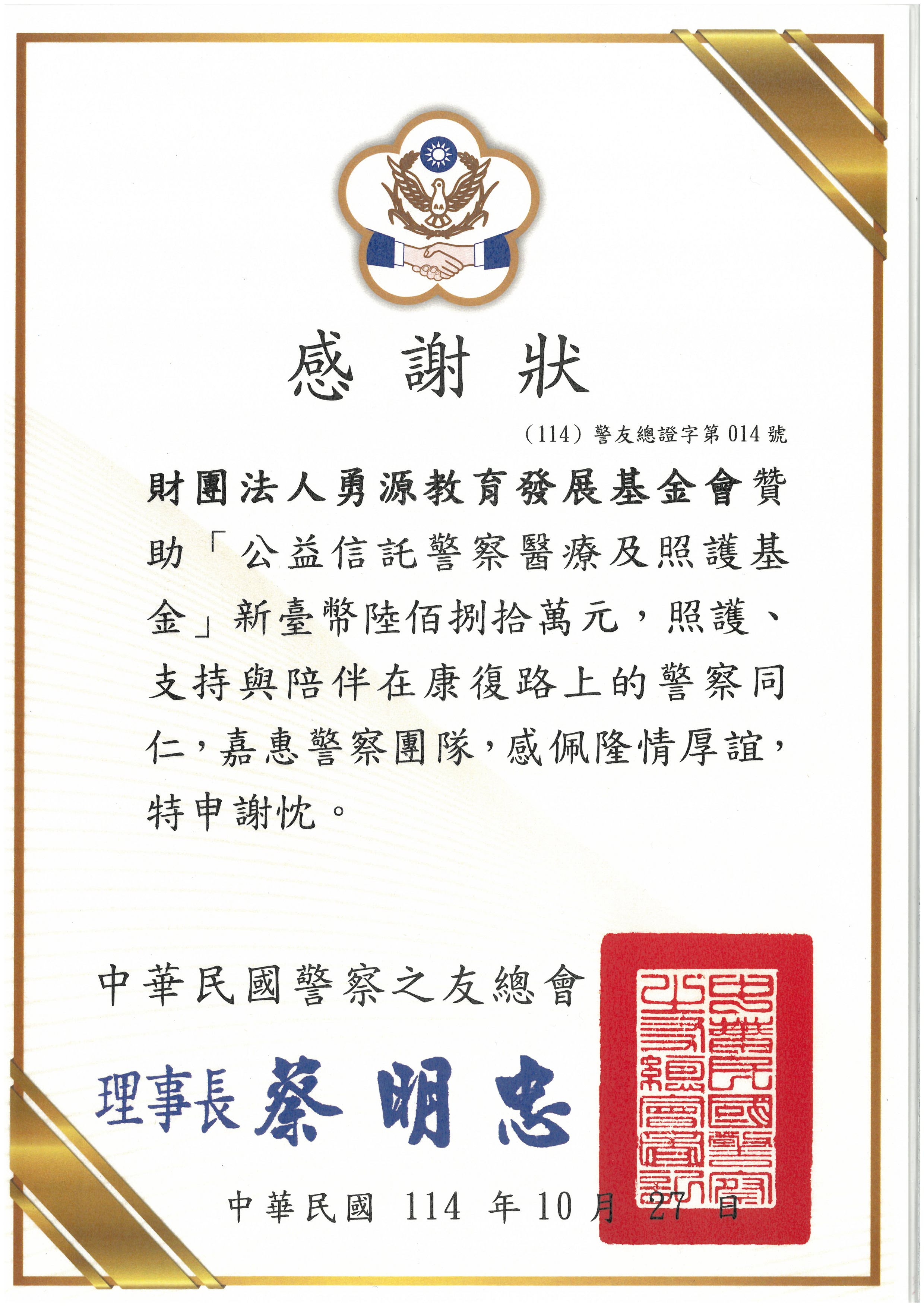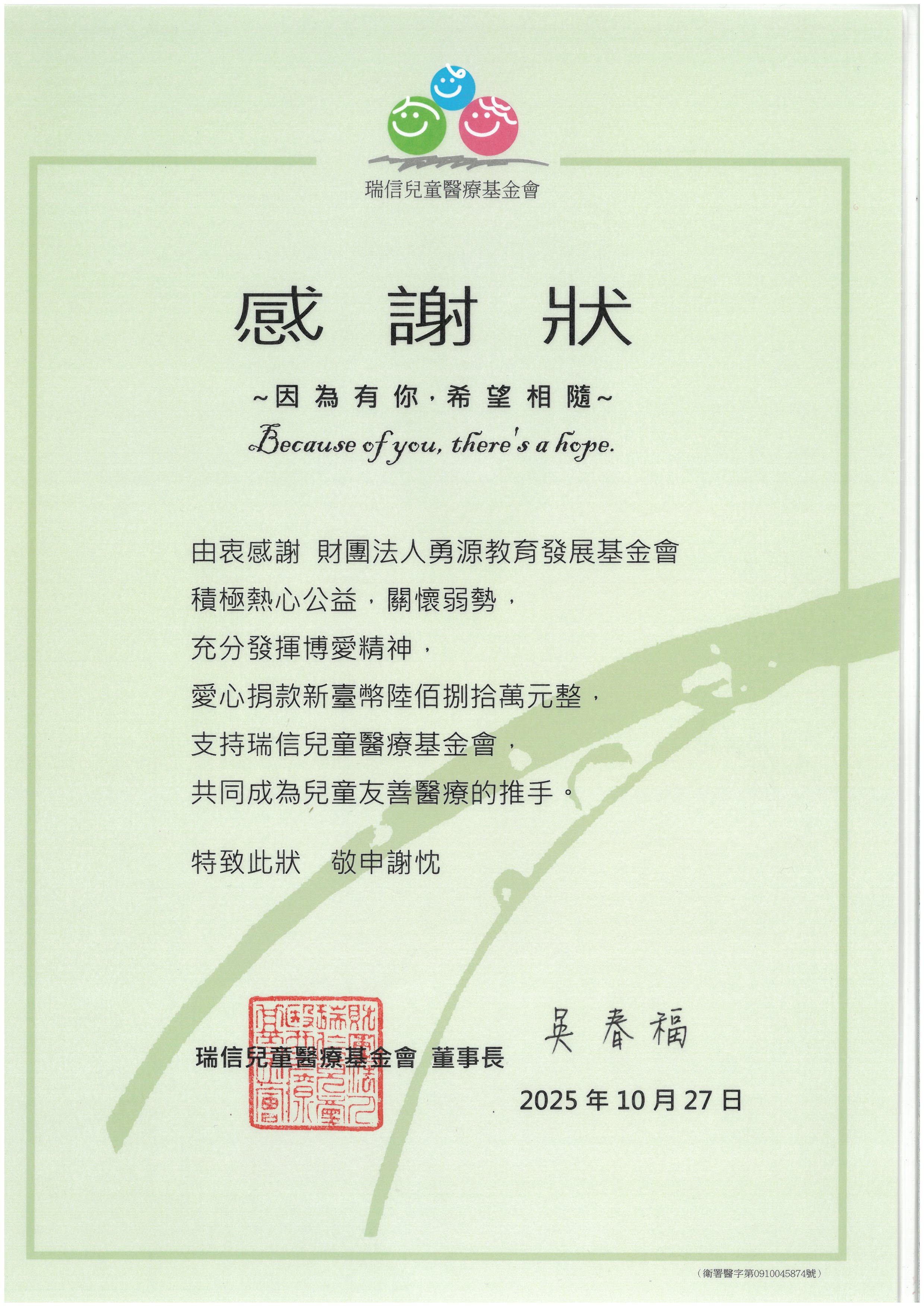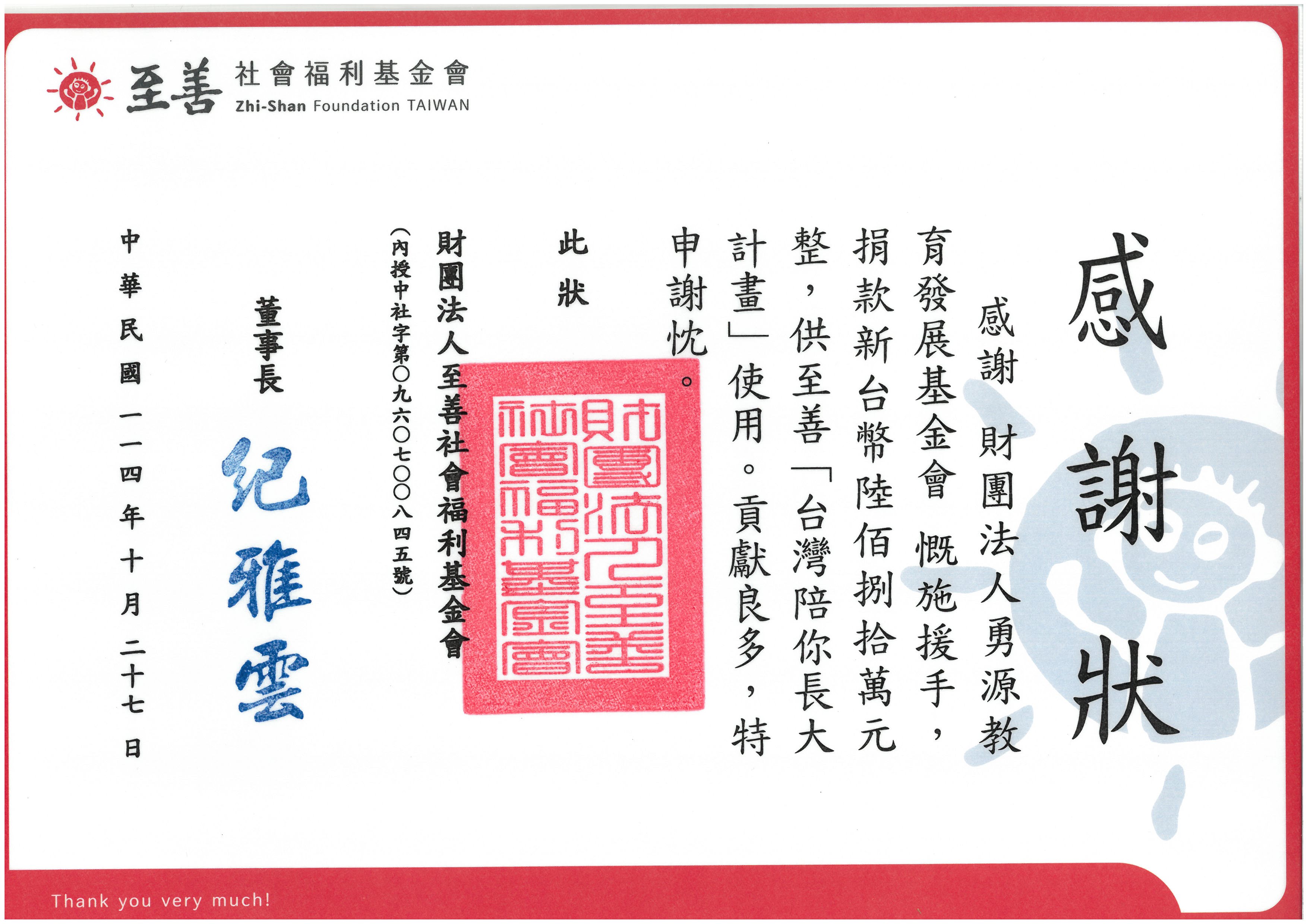 來自捐贈單位的感謝函 & 感謝狀